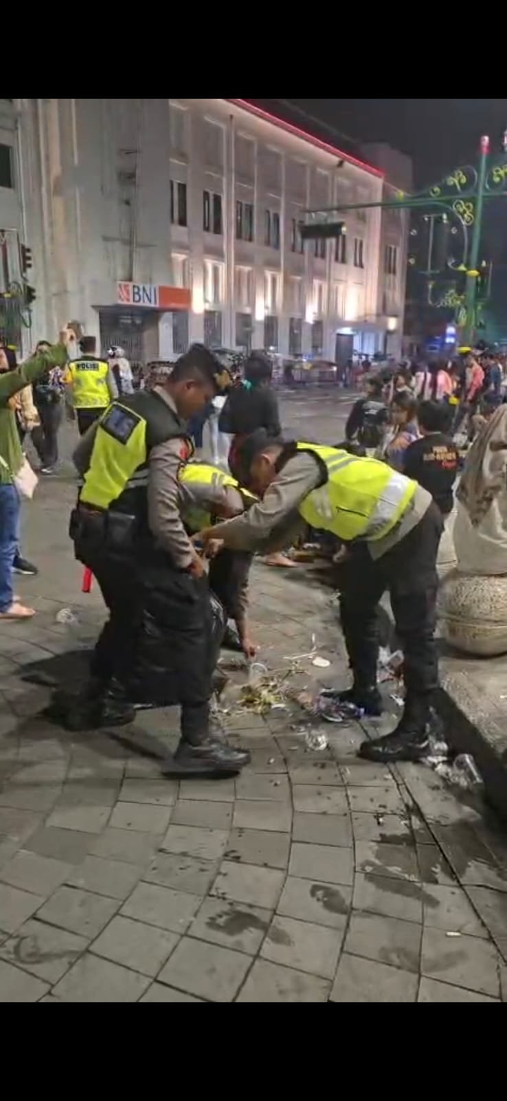 Sejumlah personel kepolisian tampak memunguti sampah yang berserakan di sepanjang kawasan Titik Nol KM. Sampah tersebut merupakan sisa aktivitas masyarakat yang merayakan malam pergantian tahun di lokasi tersebut.