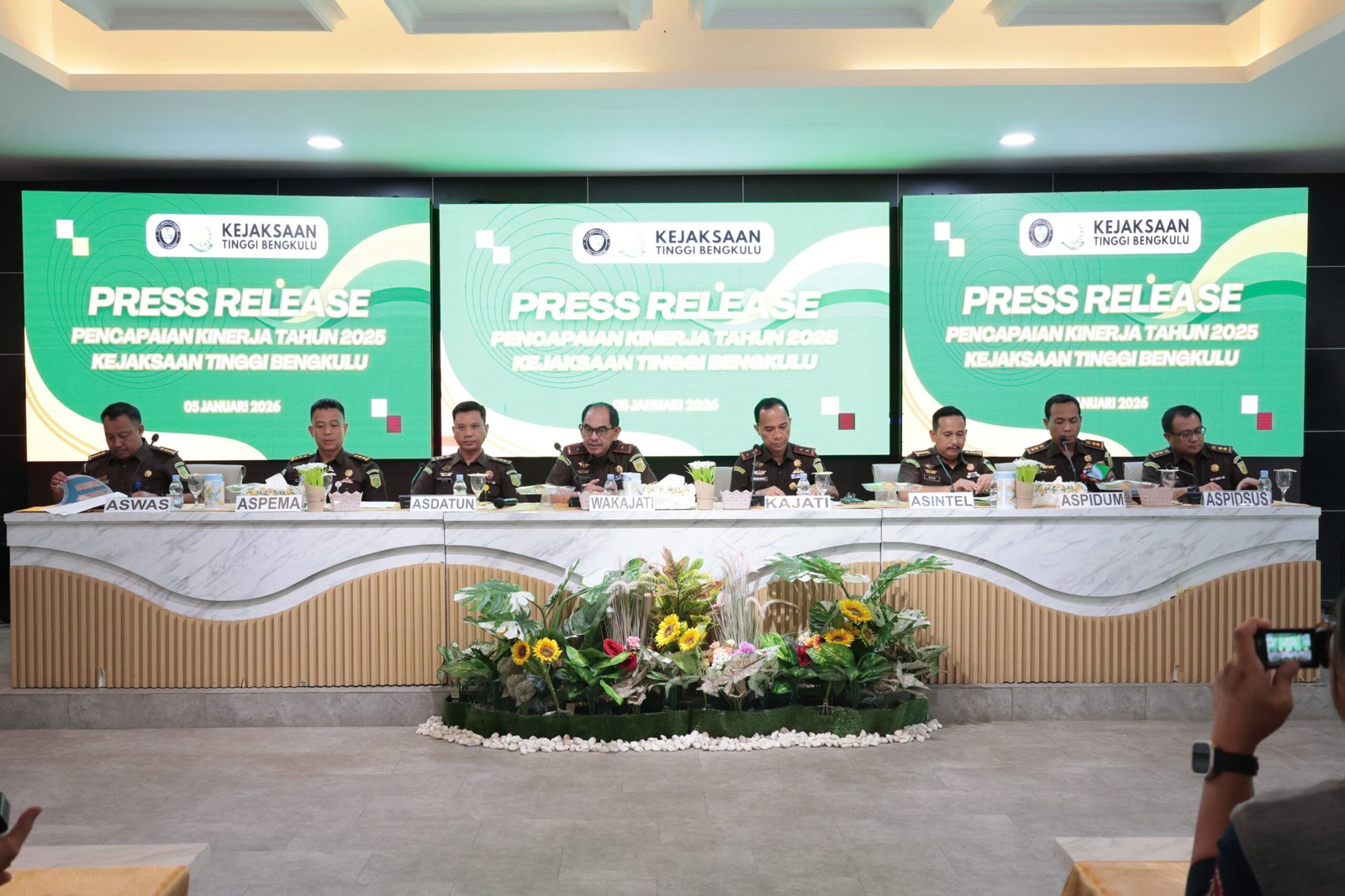 Dalam kegiatan press release capaian kinerja tahun 2025 yang digelar pada Senin (5/1/2026), Kajati Bengkulu menyampaikan bahwa seluruh bidang di lingkungan Kejati Bengkulu telah bekerja secara optimal sejak Januari hingga Desember 2025.