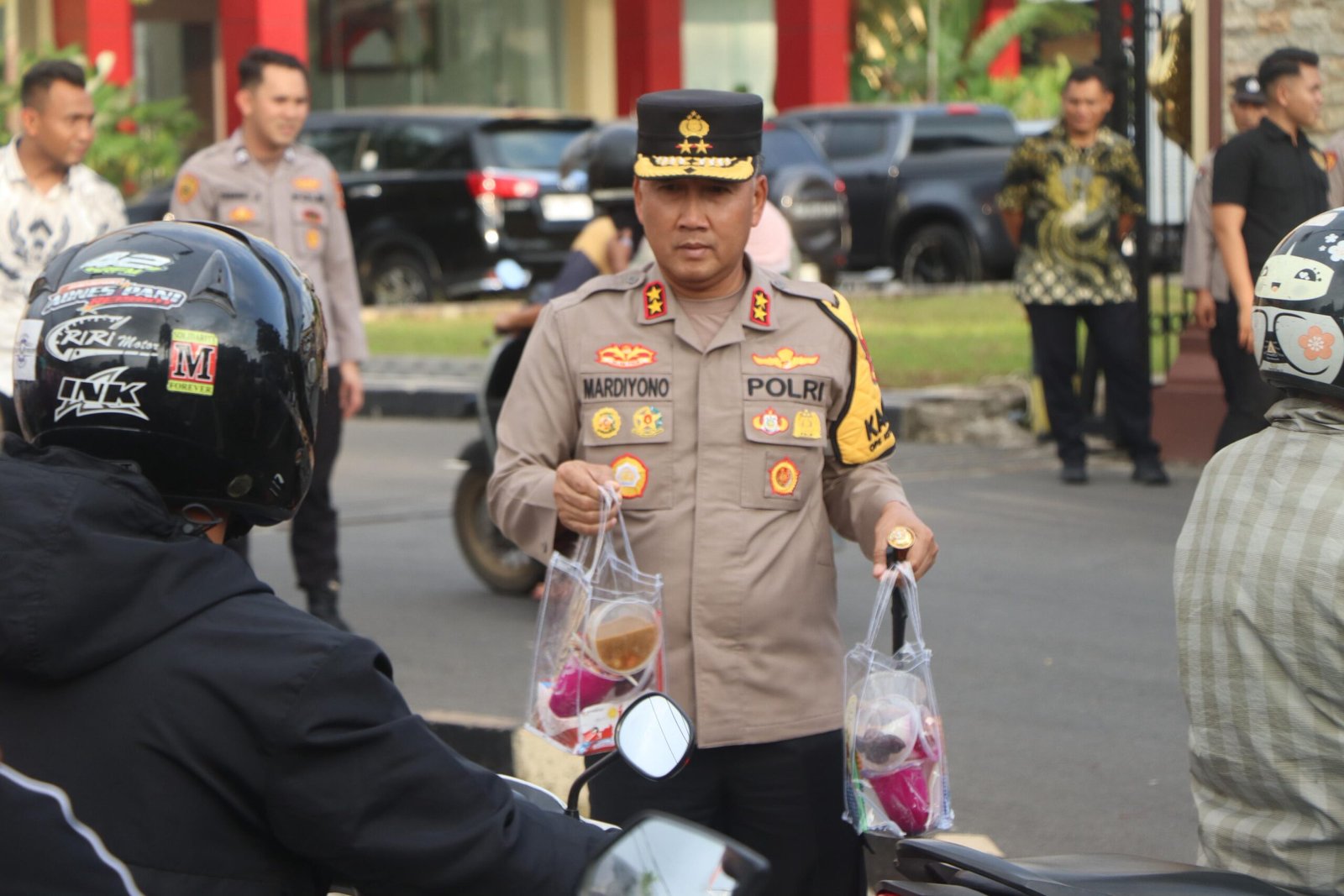 Bengkulu – Kapolda Bengkulu, Irjen Pol. Mardiyono, S.I.K., M.Si., bersama Ketua Yayasan Kemala Bhayangkari Daerah Bengkulu, Ny. Yanti Mardiyono, serta para Pejabat Utama Polda Bengkulu melaksanakan kegiatan berbagi takjil kepada masyarakat di depan Mapolda Bengkulu. Jum’at (13/3/2026) sore.