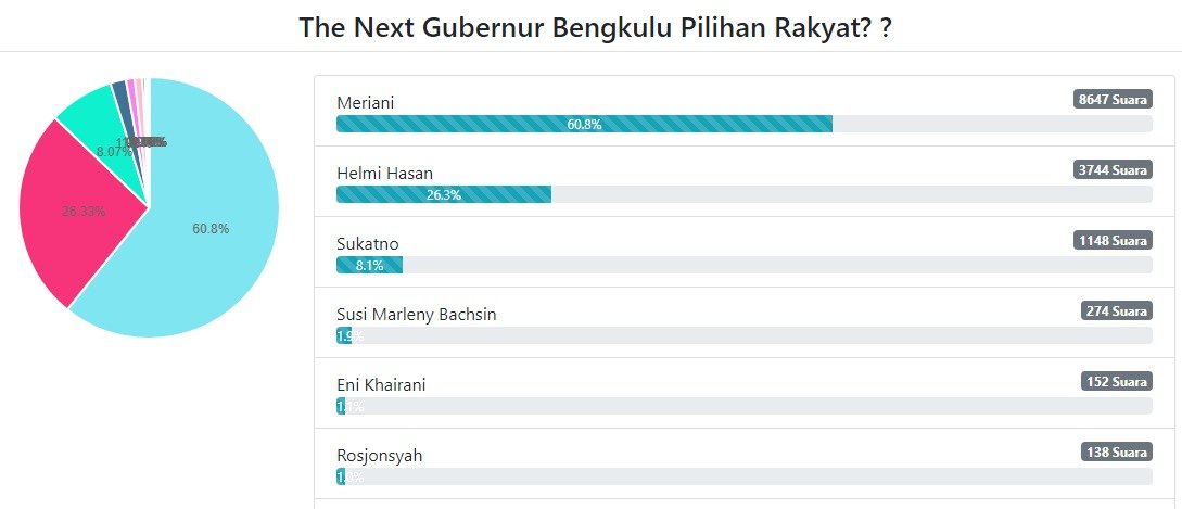 Polling ini telah menerima sebanyak 14.222 suara dan memberikan gambaran awal tentang preferensi warga Bengkulu terhadap calon gubernur berikutnya.
