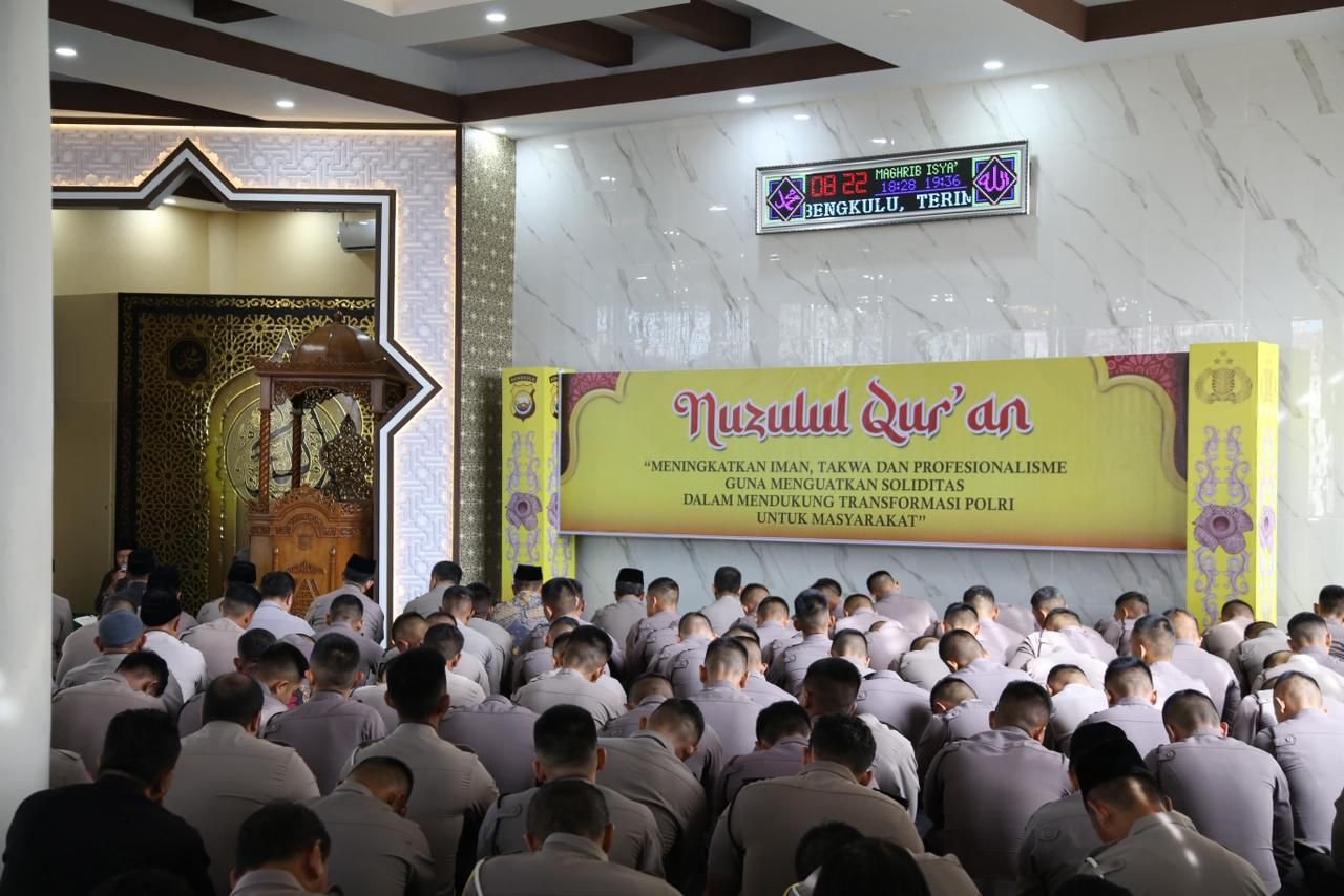 Bengkulu – Polda Bengkulu menggelar peringatan Nuzulul Qur’an 1447 H dengan tema “Meningkatkan Iman, Taqwa, dan Profesionalisme Guna Menguatkan Solidaritas dalam Mendukung Transformasi Polri untuk Masyarakat” di Masjid Al-Amin Polda Bengkulu, Jumat (6/3/2026).