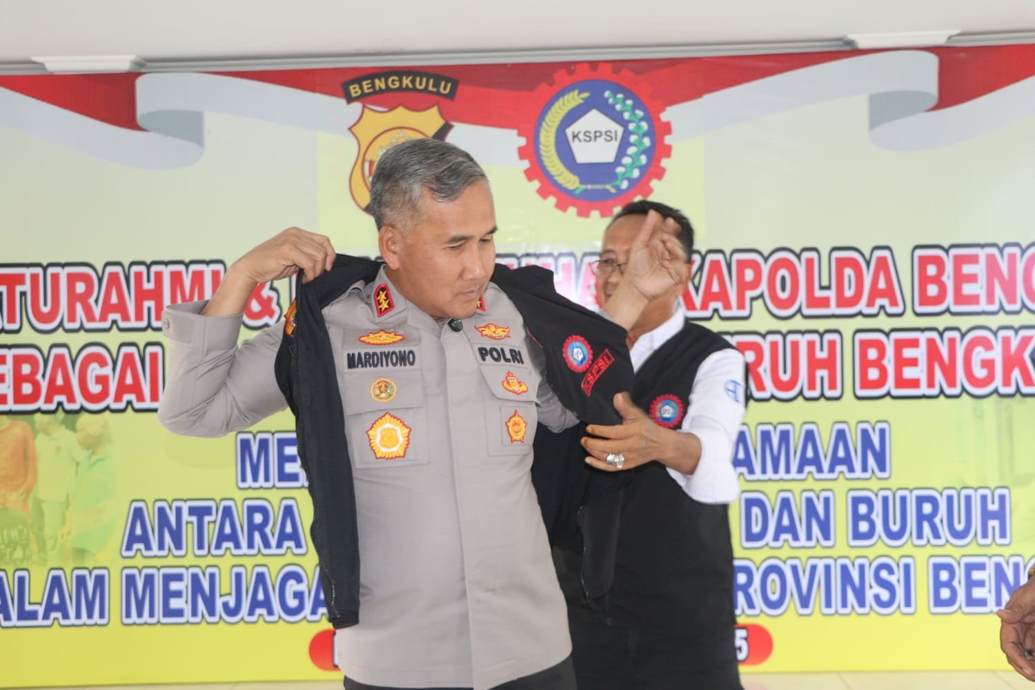 Sebagai simbol pengukuhan, perwakilan buruh secara simbolis memasangkan jaket kepada Kapolda Bengkulu. Momen tersebut menjadi simbol kehormatan, kebersamaan, dan kepercayaan buruh kepada Polri. Kegiatan kemudian dilanjutkan dengan penyerahan bantuan paket sembako kepada perwakilan buruh.